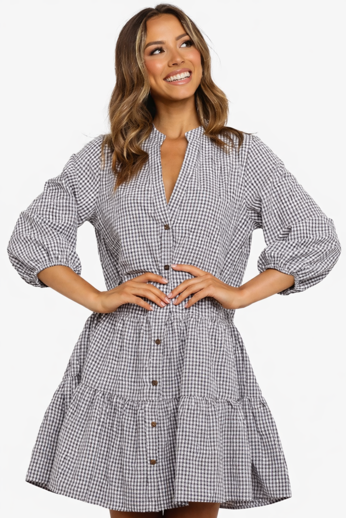 This casual dress is designed for everyday wear, offering a relaxed silhouette with a tiered structure that adds movement without feeling oversized.