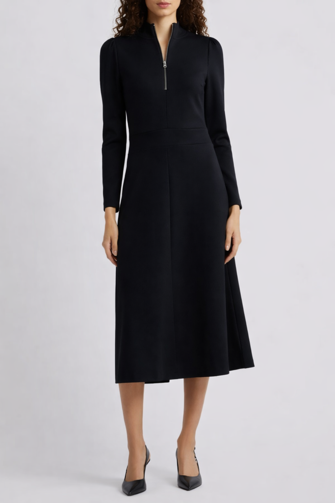 This modern midi dress offers a contemporary look with a half-zip design, making it a versatile option for newer seasonal styles.